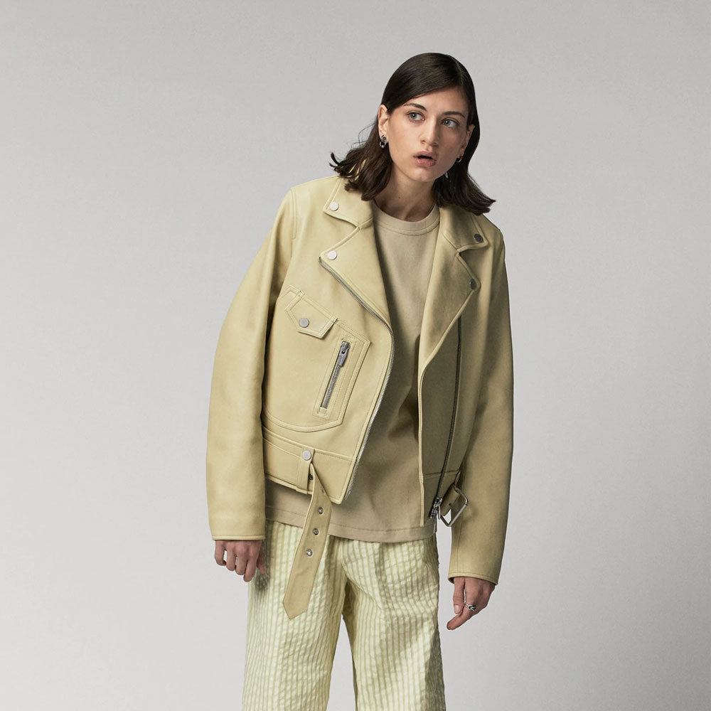 Women Beige Lambskin Motorcycle Riding Leather Biker Jacket